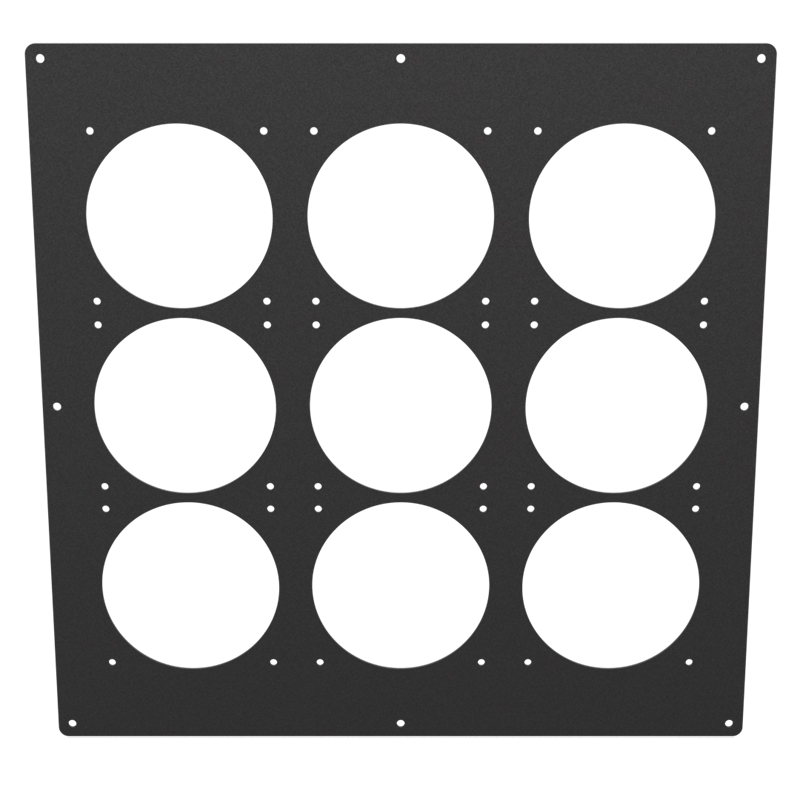 This 18x18 Triple 360 panel is a dedicated high-performance modular side/top panel designed for any Mountain Mods case with an 18x18 inch side as part of the hyper-modular panel system. It provides massive cooling capacity with a full 3×3 grid of 120mm fan mounts for extreme water-cooling configurations.
