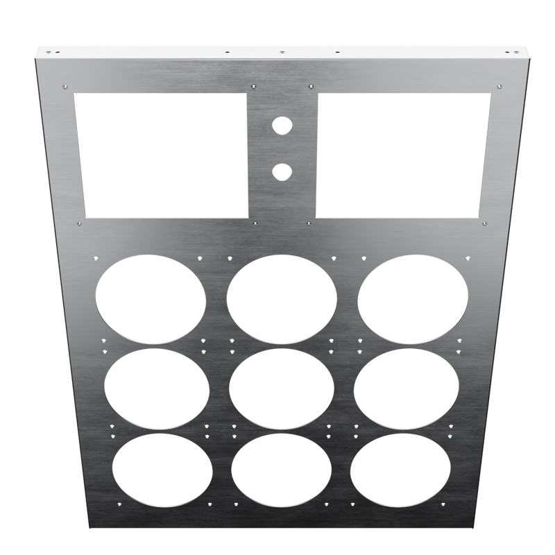 Precision-cut from heavy-gauge aluminum with two large upper openings and nine 120mm circular fan cutouts in a 3×3 layout, it is engineered for easy installation, perfect alignment, and optimal thermal performance in demanding builds.